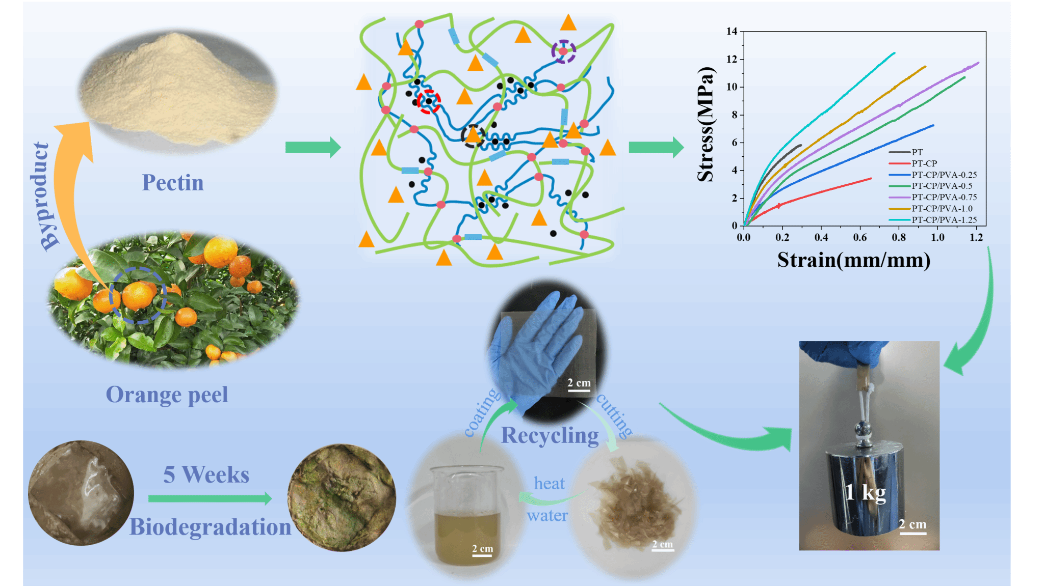 強濤濤教授通過一種簡單且環(huán)保的策略,利用生物質(zhì)材料果膠為基體材料,丙酸鈣作為交聯(lián)劑和抗菌劑,并通過添加聚乙烯醇引入結(jié)晶域,制備出含有氫鍵、結(jié)晶域和離子鍵作為犧牲鍵的多交聯(lián)果膠基食品包裝薄膜(PT-CP/PVA)。不僅實現(xiàn)了天然生物資源的可持續(xù)和高價值利用,并為發(fā)展綠色生物質(zhì)基食品包裝材料提出了新的建議。