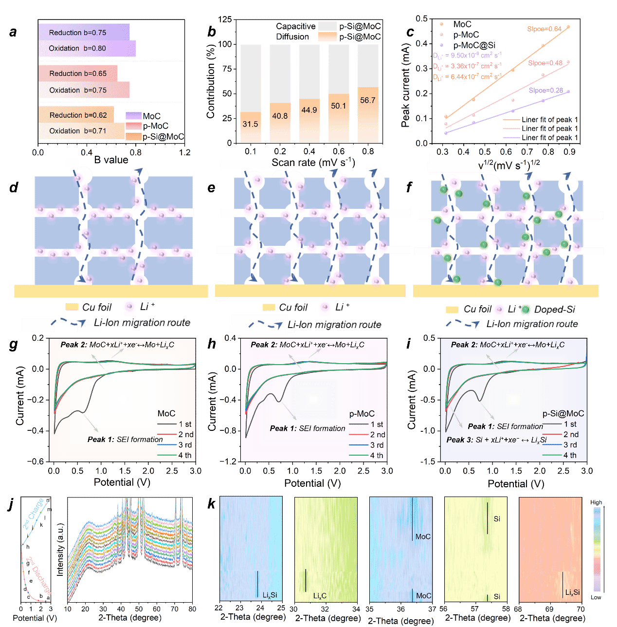 要點三:p-Si@MoC材料促進鋰離子快速動力傳輸及原位儲鋰機制