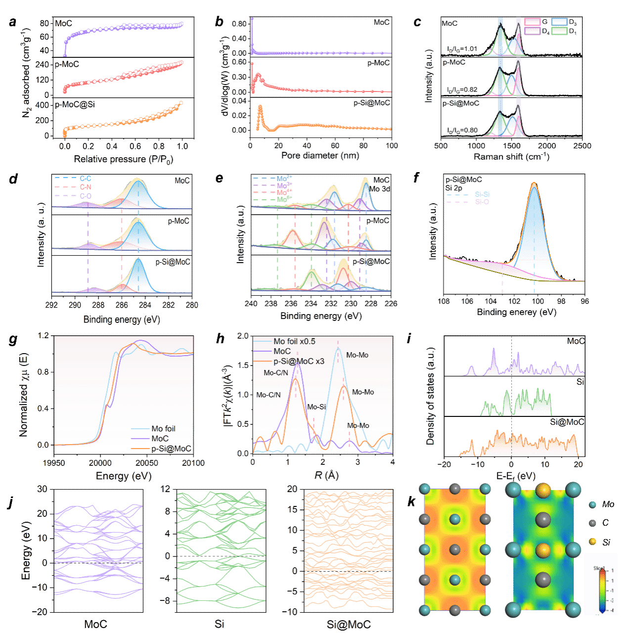 通過X射線近邊吸收光譜(XANES)和擴展X射線吸收精細結(jié)構(gòu)譜(EXAFS),驗證了Si摻雜在MoC基體中形成的Mo-Si鍵。通過密度泛函理論(DFT)的計算,揭示了多孔Si@MoC優(yōu)異的電導率和電子傳遞能力。