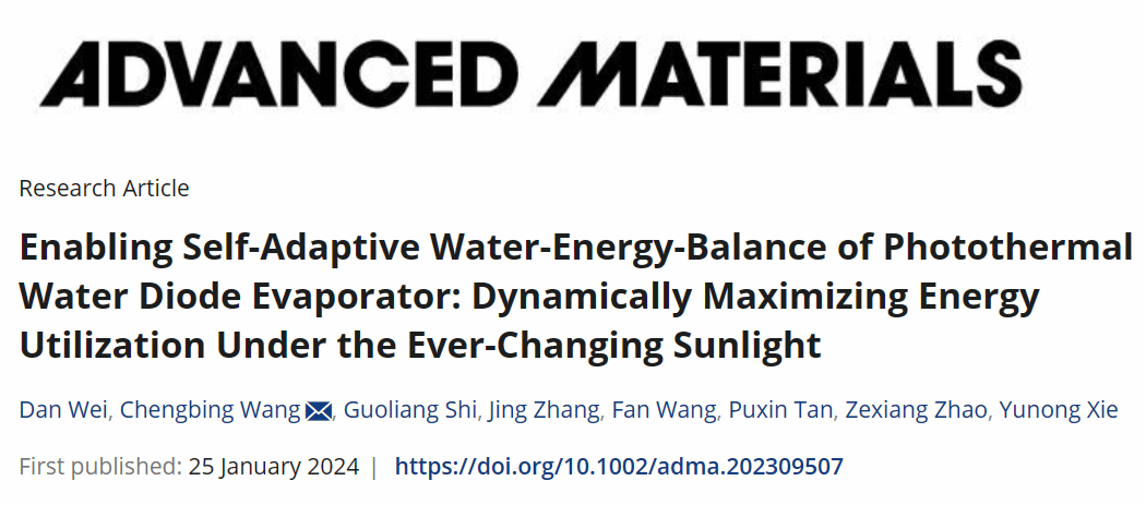 近日,我校材料科學(xué)與工程學(xué)院光熱轉(zhuǎn)換材料功能化調(diào)控及應(yīng)用創(chuàng)新團隊在材料學(xué)國際頂級期刊《Advanced Materials》上發(fā)表了題為“Enabling Self-Adaptive Water-Energy-Balance of Photothermal Water Diode Evaporator: Dynamically Maximizing Energy Utilization Under the Ever-Changing Sunlight”的研究性論文。王成兵教授為論文通訊作者,碩士研究生衛(wèi)丹為論文第一作者,陜西科技大學(xué)為唯一署名單位。