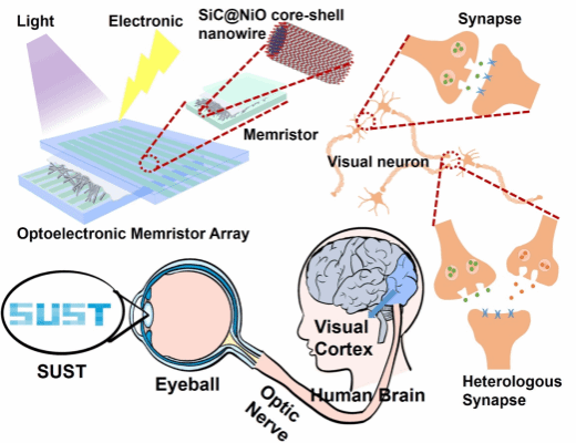 憶阻器是一種新型的電子元件,其作用類同于大腦中信息處理基本單元的神經(jīng)突觸功能,用其構(gòu)建的芯片具有類腦學(xué)習(xí)和低功耗的特點(diǎn),是未來神經(jīng)形態(tài)器件和人工智能器件重要發(fā)展方向。近日,我校物理與信息科學(xué)學(xué)院材料原子分子科學(xué)研究所許并社領(lǐng)導(dǎo)的認(rèn)知材料團(tuán)隊(duì)尉國棟教授在著名國際學(xué)術(shù)期刊《Small》上發(fā)表題為“SiC@NiO Core-Shell Nanowire Networks-Based Optoelectronic Synapses for Neuromorphic Computing and Visual Systems at High Tempersture”的高水平論文。我校碩士研究生申偉康為第一作者,物理學(xué)院王盼老師為共同第一作者,尉國棟教授和李國強(qiáng)教授為共同通訊作者,陜西科技大學(xué)為第一通訊單位,華南理工大學(xué)為共同通訊單位,該論文的發(fā)表標(biāo)志著我校在基于第三代半導(dǎo)體碳化硅基光電突觸器件在神經(jīng)形態(tài)計(jì)算和人工視覺系統(tǒng)方面的突破。