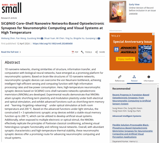 SiC@NiO Core-Shell Nanowire Networks-Based Optoelectronic Synapses for Neuromorphic Computing and Visual Systems at High Tempersture. Weikang Shen+, Pan Wang+, Guodong Wei*, Shuai Yuan, Mi Chen, Ying Su, Bingshe Xu, and Guoqiang Li*