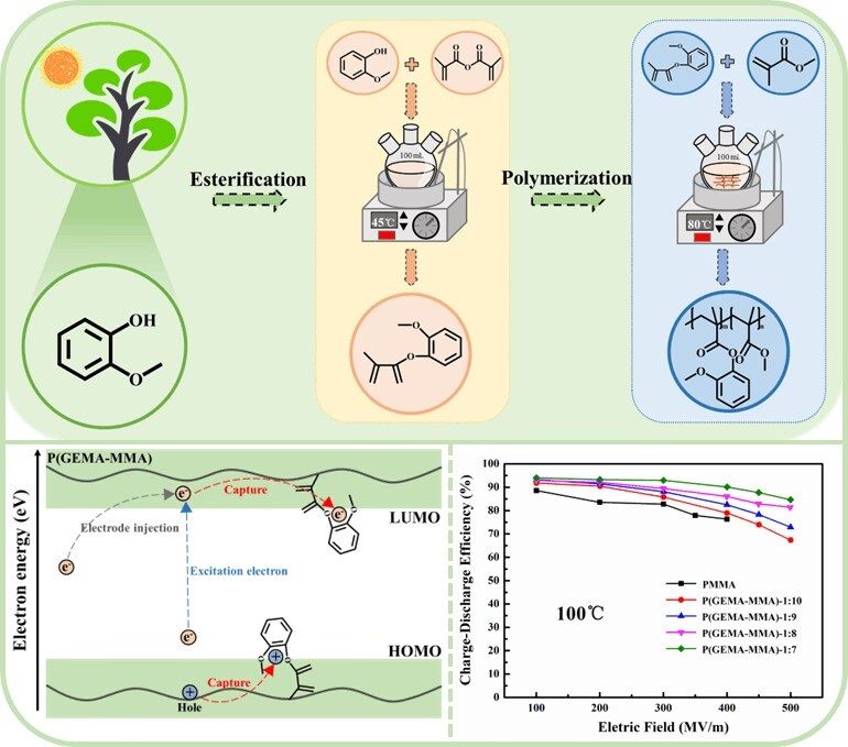 本論文的創(chuàng)新之處在于將生物質(zhì)材料丙烯酸愈創(chuàng)木酚酯(GEMA)與甲基丙烯酸甲酯(MMA)制備了一種新型生物基共聚物電介質(zhì)—聚(愈創(chuàng)木酚甲基丙烯酸酯-甲基丙烯酸甲酯)[P(GEMA-MMA)],發(fā)現(xiàn)了愈創(chuàng)木酚結(jié)構(gòu)的高HOMO能級有助于捕獲和陷阱自由電荷載體,顯著提升了材料的能量存儲性能,室溫下的擊穿強度高達710.5 MV/m,比純PMMA高出32.5%,且在500 MV/m下的充放電效率達到了87.0%,遠高于純PMMA的70%。即使在100°C高溫條件下,其能量存儲效率仍可維持在84.7%的高水平。此研究為生物基電介質(zhì)薄膜的開發(fā)提供了一種新方法。