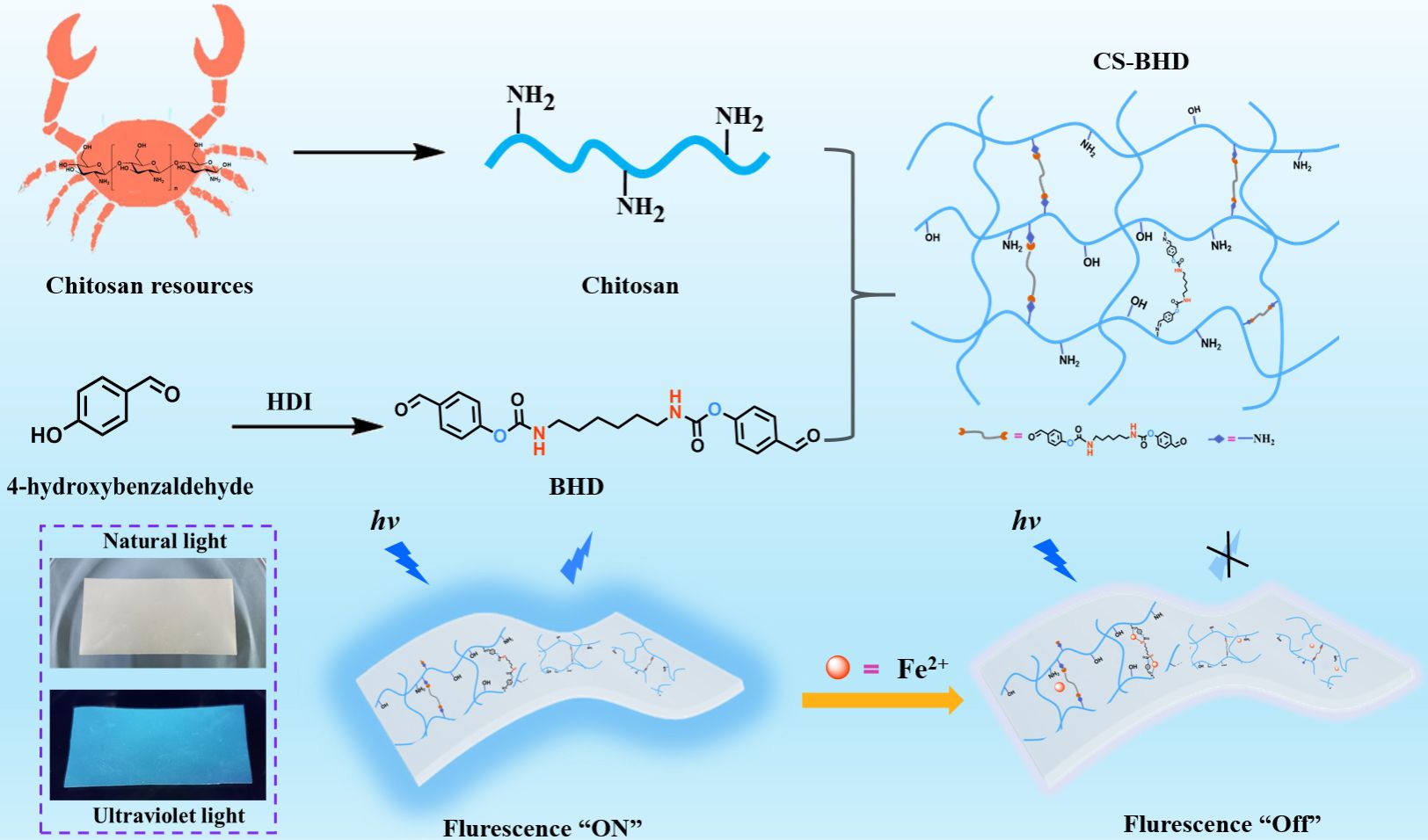 本論文的創(chuàng)新之處在于制備了一種以殼聚糖為基材、以雙苯甲醛(BHD)為交聯(lián)劑的熒光殼聚糖基水凝膠薄膜(CSBHD),該薄膜具有靈敏檢測Fe2+和高效吸附Fe2+離子的性能。CSBHD薄膜能夠在0-160 -1范圍內(nèi)對Fe2+離子顯示出線性熒光強度響應,極低檢測限為0.55 μ.,最大吸附容量為223.5 g/mg。該材料為環(huán)境監(jiān)控和Fe2+等重金屬離子吸附提供了新方法。