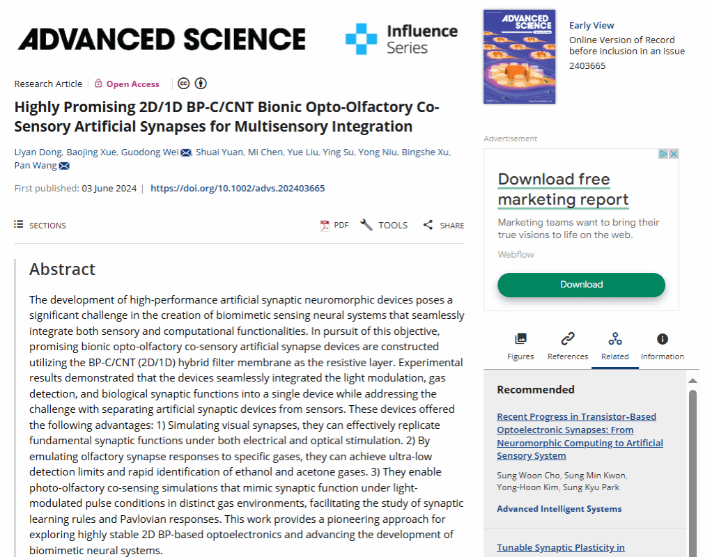 Highly Promising 2D/1D BP-C/CNT Bionic Opto-Olfactory Co-Sensory Artificial Synapses for Multisensory Integration. Liyan Dong+, Baojing Xue+, Guodong Wei*, Shuai Yuan, Mi Chen, Yue Liu, Ying Su, Yong Niu, Bingshe Xu, Pan Wang*