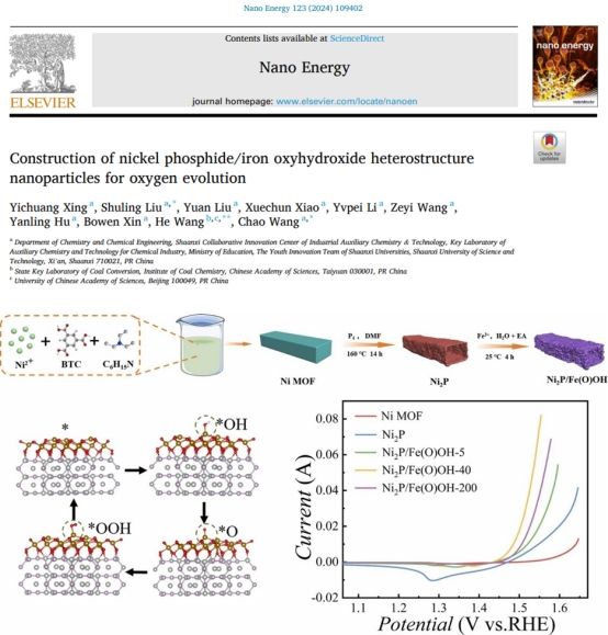 [2] Yichuang Xing, Shuling Liu, Yuan Liu, Xuechun Xiao, Yvpei Li, Zeyi Wang, Yanling Hu, Bowen Xin, He Wang, Chao Wang. Construction of nickel phosphide/iron oxyhydroxide heterostructure nanoparticles for oxygen evolution, Nano Energy, 2024, 123: 109402.