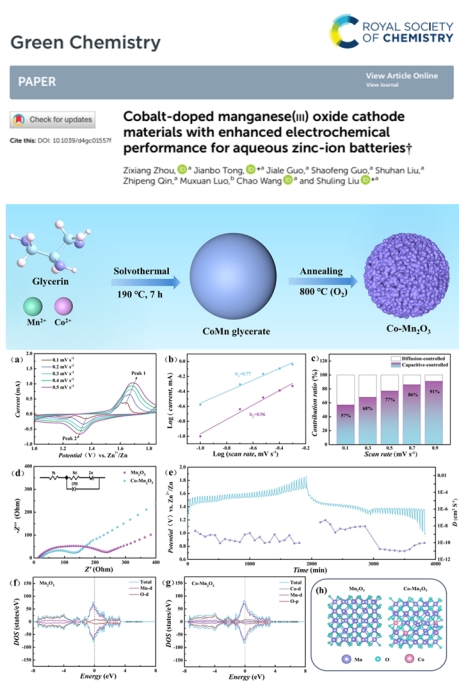 [10] Zixiang Zhou, Jianbo Tong, Jiale Guo, Shaofeng Guo, Shuhan Liu, Zhipeng Qin, Muxuan Luo, Chao Wang, Shuling Liu. Cobalt-doped manganese (III) oxide cathode materials with enhanced electrochemical performance for aqueous zinc-ion batteries, Green Chemistry, 2024, 26 (11): 6704-6712.