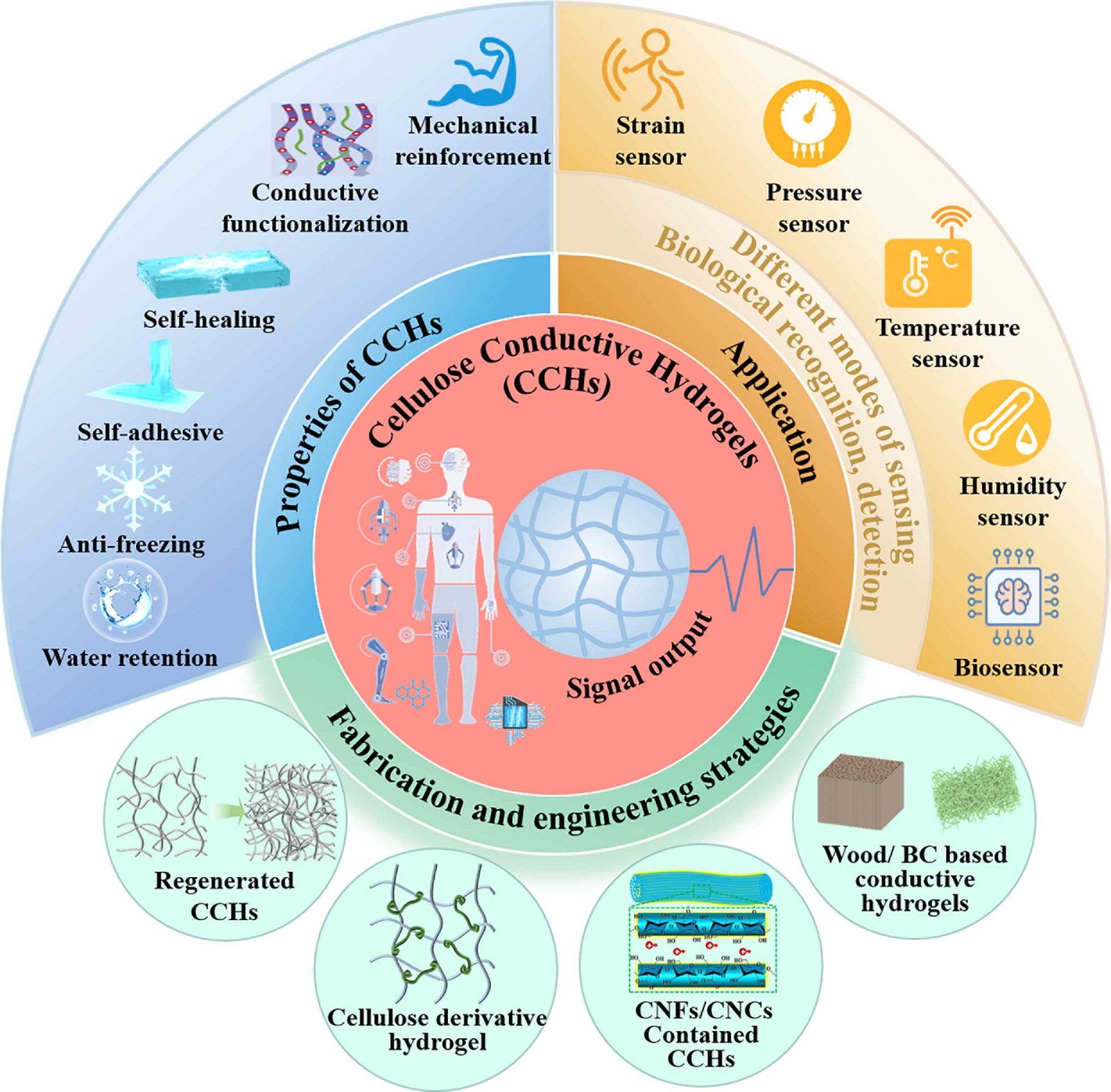 導(dǎo)電水凝膠因其可調(diào)的機(jī)械性能和穩(wěn)定的導(dǎo)電性,成為柔性傳感器開發(fā)的重要基礎(chǔ)材料。在制備“綠色”、高性能柔性傳感器的過程中,源自天然纖維素的柔性水凝膠因其獨(dú)特的可再生、低成本、易改性和機(jī)械性能,其結(jié)構(gòu)和功能設(shè)計正引起越來越多的關(guān)注。本團(tuán)隊(duì)系統(tǒng)綜述了纖維素導(dǎo)電水凝膠的結(jié)構(gòu)特征、材料構(gòu)成和制備方法,重點(diǎn)討論了纖維素導(dǎo)電水凝膠的性能、增強(qiáng)策略和傳感特性之間的相關(guān)性。最后,對纖維素導(dǎo)電水凝膠目前面臨的挑戰(zhàn)及應(yīng)用前景進(jìn)行了展望。該工作以題為“Cellulose-Based Conductive Hydrogels for Emerging Intelligent Sensors”發(fā)表在《Advanced Fiber Materials》上。博士研究生姚雪為本文第一作者,張素風(fēng)教授和錢立偉副教授為該論文的共同通訊作者。