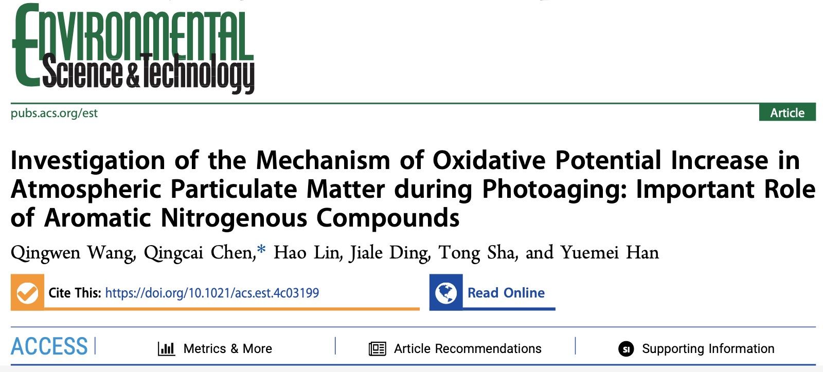 近日,環(huán)境學院陳慶彩教授團隊關(guān)于大氣污染健康風險的研究成果,在大氣領(lǐng)域頂級期刊《Environmental Science & Technology》(中科院一區(qū)TOP,自然指數(shù)期刊)上發(fā)表,題目為“Investigation of the mechanism of oxidative potential increase in atmospheric particulate matter during photoaging: important role of aromatic nitrogenous compounds”。陳慶彩教授為唯一通訊作者,碩士研究生王擎雯為第一作者,陜西科技大學為第一單位和唯一通訊單位。