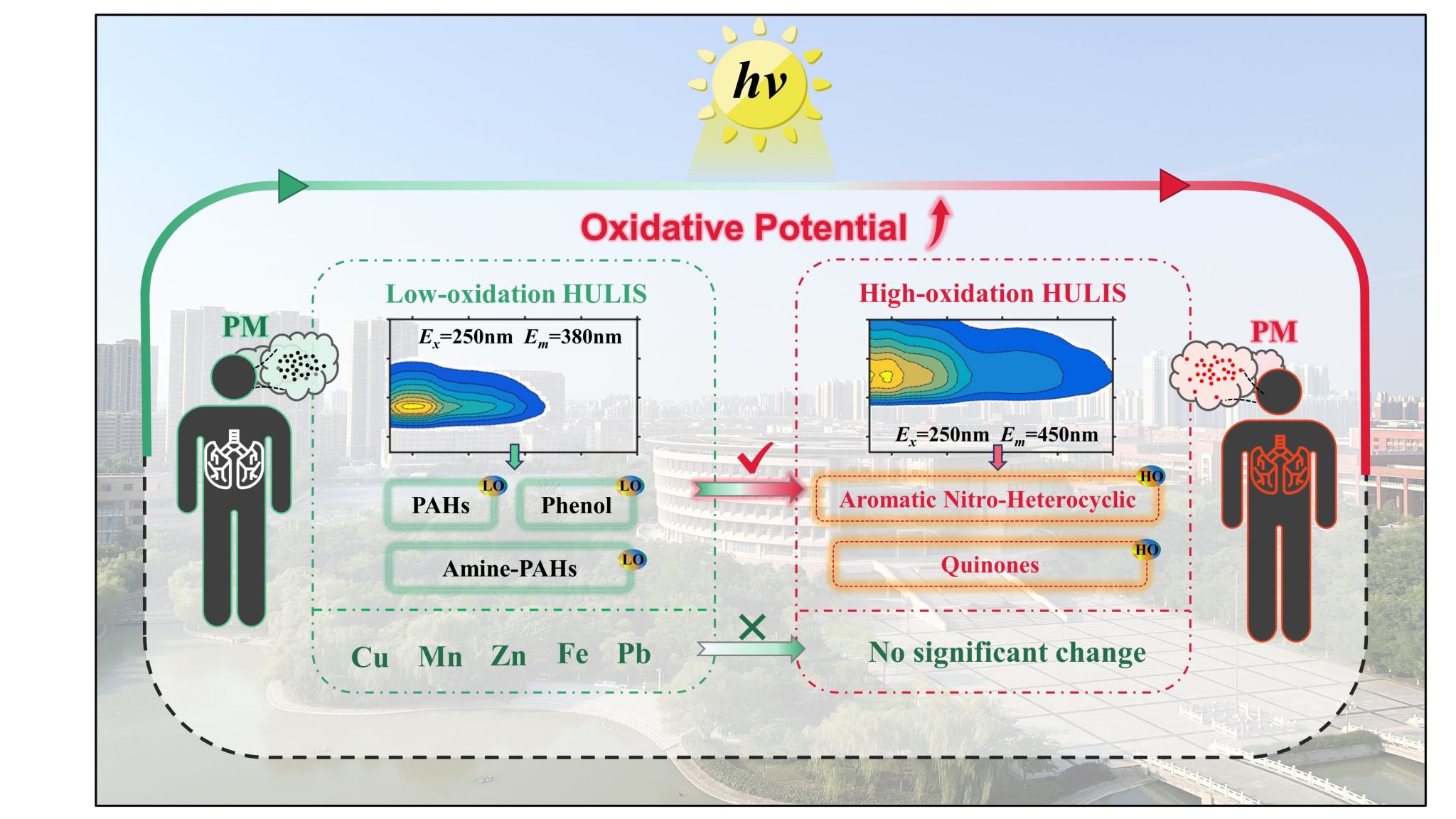 研究發(fā)現(xiàn)太陽光照可以使大氣顆粒物的氧化毒性顯著增強,證實了自然因素對大氣顆粒物健康風險的影響事實。經(jīng)過化學分析和機制探討,發(fā)現(xiàn)大氣顆粒物毒性增加主要是由于光照引發(fā)二次有機毒性分子和持久性自由基的生成。其中,醌類分子是產(chǎn)生二次氧化毒性最主要原因,硝基酚類化合物和含氮雜環(huán)化合物發(fā)揮了催化作用,促進了新的氧化毒性化合物生成和催化產(chǎn)生活性氧自由基的產(chǎn)生。這一發(fā)現(xiàn)揭示了太陽光照條件下大氣顆粒物毒性變化的關(guān)鍵驅(qū)動因素和分子機制,不僅豐富了大氣顆粒物在實際環(huán)境中毒性變化的科學理論,還為應(yīng)對環(huán)境污染與健康風險提供了新的認知和方法指導(dǎo)。