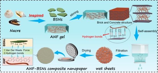團(tuán)隊利用化學(xué)輔助機(jī)械法首次從玄武巖鱗片(BS)中制備了具有超高徑厚比(約780.1)的玄武巖納米片(BSNs)。隨后,通過真空輔助自組裝法將BSNs與芳綸納米纖維(ANF)組裝成仿貽貝結(jié)構(gòu)的ANF-BSNs復(fù)合納米紙。該復(fù)合紙在極低的BSNs含量下具有明顯的層狀結(jié)構(gòu),顯著提升了復(fù)合納米紙的機(jī)械性能和絕緣性能,使其在現(xiàn)代小型化高功率電氣設(shè)備中具有廣闊的應(yīng)用前景。研究成果以“Novel Fabrication of Basalt Nanosheets with Ultrahigh Aspect Ratios Toward Enhanced Mechanical and Dielectric Properties of Aramid Nanofiber-Based Composite Nanopapers”發(fā)表在《Advanced Science》上。博士研究生戢德賢為本研究的主要完成人,宋順喜副教授、張美云教授為通訊作者。