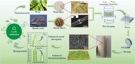 團(tuán)隊通過濕成型和硅烷蒸汽處理制備了纖維素/玄武巖纖維寬頻吸聲復(fù)合紙(CBF)。由于引入了環(huán)保型玄武巖纖維,復(fù)合紙的孔結(jié)構(gòu)和熱傳導(dǎo)路徑得到了調(diào)整,從而提高了吸聲和隔熱性能。特別是50 wt%的玄武巖纖維復(fù)合紙表現(xiàn)出較高的吸聲系數(shù)和超低的熱導(dǎo)率,制備的CBF復(fù)合紙在2000-6000 Hz中高頻范圍內(nèi)的吸聲系數(shù)提高了3.2-5.8倍。此外,復(fù)合紙還具有良好的疏水性,經(jīng)硅烷蒸汽處理后的接觸角在92.3°到132.9°之間,顯示出優(yōu)異的防水性能和自清潔能力?;谪S富且低成本的天然資源和現(xiàn)代造紙工藝,CBF復(fù)合紙為綠色吸聲材料和室內(nèi)裝飾領(lǐng)域的大規(guī)模應(yīng)用提供了廣闊的可能性。研究成果以“Broadband sound absorption cellulose/basalt fiber composite paper with excellent thermal insulation and hydrophobic properties”發(fā)表在《Industrial Crops & Products》上。碩士研究生呂堉溟為本研究的主要完成人,宋順喜副教授為通訊作者。