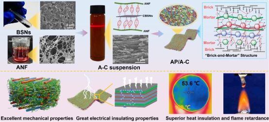 團(tuán)隊提出了一種仿貽貝結(jié)構(gòu)的復(fù)合芳綸紙概念,通過將羰基化改性的玄武巖納米片植入芳綸納米纖維(ANF)的三維網(wǎng)狀結(jié)構(gòu)中構(gòu)建仿貽貝層狀結(jié)構(gòu),然后通過浸漬法將其填充至芳綸紙(AP)的多孔結(jié)構(gòu)中形成復(fù)合紙(AP/ANF-CBSNs),制得的AP/ANF-CBSNs復(fù)合紙的內(nèi)部和表面形成了仿貽貝層狀結(jié)構(gòu),使其具有優(yōu)異的機(jī)械性能、絕緣性能、耐久性、隔熱性和顯著的阻燃性。仿珍珠母結(jié)構(gòu)和浸漬策略為開發(fā)先進(jìn)的電絕緣紙材料提供了一種有效途徑,適用于高頻率和高電壓電氣工程設(shè)備。研究成果以“Nacre-inspired composite papers with enhanced mechanical and electrical insulating properties: Assembly of aramid papers with aramid nanofibers and basalt nanosheets”發(fā)表在《Journal of Materials Science & Technology》上。博士研究生戢德賢為本研究的主要完成人,宋順喜副教授、張美云教授、倪永浩教授為通訊作者。