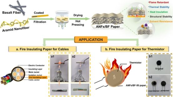 團(tuán)隊通過真空輔助過濾工藝,將環(huán)保型玄武巖纖維(BF)與高性能芳綸納米纖維(ANFs)協(xié)同集成,制備了一種有機(jī)-無機(jī)纖維交替層狀結(jié)構(gòu)的復(fù)合紙。該復(fù)合紙展示出低熱導(dǎo)率、高抗拉強度和優(yōu)異的柔韌性。在300℃熱處理60分鐘后,機(jī)械強度保持率高達(dá)92%。制備的ANFs/BF復(fù)合紙的峰值熱釋放率和煙氣生成量分別減少了44.6%和95.3%,顯示出其卓越的阻燃性能。此外,復(fù)合紙在極端條件下(如酸堿和高低溫環(huán)境)仍保持優(yōu)良的結(jié)構(gòu)穩(wěn)定性和機(jī)械性能。這種仿珍珠母結(jié)構(gòu)的復(fù)合紙在柔性電子設(shè)備、阻燃和高溫領(lǐng)域中作為保護(hù)層具有廣闊的應(yīng)用前景。研究成果以“Nacre-Inspired Aramid Nanofibers/Basalt Fibers Composite Paper with Excellent Flame Retardance and Thermal Stability by Constructing an Organic?Inorganic Fiber Alternating Layered Structure”發(fā)表在《ACS Applied Materials & Interfaces》上。碩士王倩玉為本研究的主要完成人,宋順喜副教授為通訊作者。