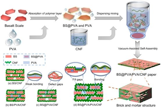 團(tuán)隊利用纖維素納米纖絲(CNF)、聚乙烯醇(PVA)和玄武巖鱗片(BS)為原料,通過真空輔助自組裝法,制備了具有優(yōu)異機(jī)械強度、電絕緣性和抗紫外線性能的層狀復(fù)合紙,通過預(yù)混聚PVA與BS,促進(jìn)了BS與CNF之間的界面結(jié)合力。同時,未吸附的PVA增加了混合溶液的粘度,防止了CNF絮凝,進(jìn)一步增強了材料的均勻性和分散性,這種層狀結(jié)構(gòu)顯著提高了復(fù)合紙的機(jī)械性能、電絕緣性能和抗紫外老化性能。研究成果以“Nacre-inspired composite paper of PVA crosslinked basalt scale and nanocellulose with enhanced mechanical, electrical insulating and ultraviolet-resistant aging performance”發(fā)表在《International Journal of Biological Macromolecules》上。碩士吳琪為本研究的主要完成人,宋順喜副教授、張美云教授為通訊作者。