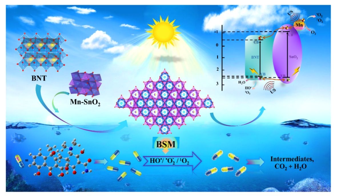 近年來,壓電光催化技術(shù)作為一種新興的污染治理方法,因其能夠在外部應(yīng)力作用下促進(jìn)光催化反應(yīng)而受到廣泛關(guān)注。在這一領(lǐng)域中,鉍基復(fù)合氧化物由于其獨(dú)特的壓電特性和良好的可見光響應(yīng)性,引起了研究人員的廣泛興趣。然而,盡管該類材料在催化降解中的潛力巨大,但其不同形態(tài)和結(jié)構(gòu)的優(yōu)化仍是提升催化性能的關(guān)鍵問題。針對這一挑戰(zhàn),研究發(fā)展了一種BNT@Mn-SnO2(BSM)異質(zhì)復(fù)合材料的合成方法,該材料結(jié)合了Bi0.5Na0.5TiO3(BNT)、錳納米粒子和SnO2。通過超聲波與可見光聯(lián)合照射,成功地在60分鐘內(nèi)實(shí)現(xiàn)了四環(huán)素(TC)的95.4%降解,顯著優(yōu)于傳統(tǒng)催化方法。BNT的固有電場與錳納米粒子的等離子體特性有效促進(jìn)了電荷的分離和傳輸,進(jìn)一步拓寬了光的吸收范圍,從而提高了光催化反應(yīng)的效率。該研究為提高抗生素降解效率提供了新的思路,并為開發(fā)更高效的廢水處理技術(shù)奠定了基礎(chǔ)。