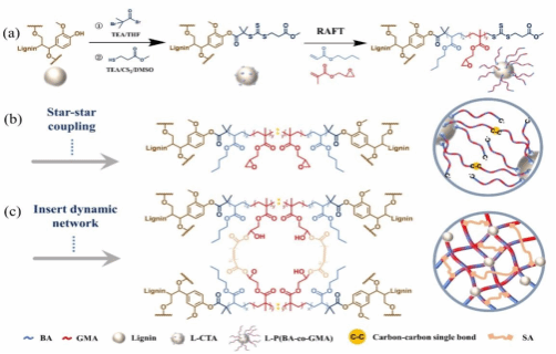 薛白亮教授等利用五/六元環(huán)碳酸酯反應(yīng)特點(diǎn),提出了具有動(dòng)態(tài)交聯(lián)結(jié)構(gòu)的新型木質(zhì)素基非異氰酸酯聚氨酯合成路線?;谛切湍举|(zhì)素接枝共聚物的可控合成,利用核-核副反應(yīng)與動(dòng)態(tài)化學(xué)策略,構(gòu)建了木質(zhì)素基動(dòng)態(tài)雙網(wǎng)絡(luò)結(jié)構(gòu),探究了其在膠黏劑和可降解塑料等領(lǐng)域的應(yīng)用。該研究發(fā)表于Polymer Chemistry等國際期刊。