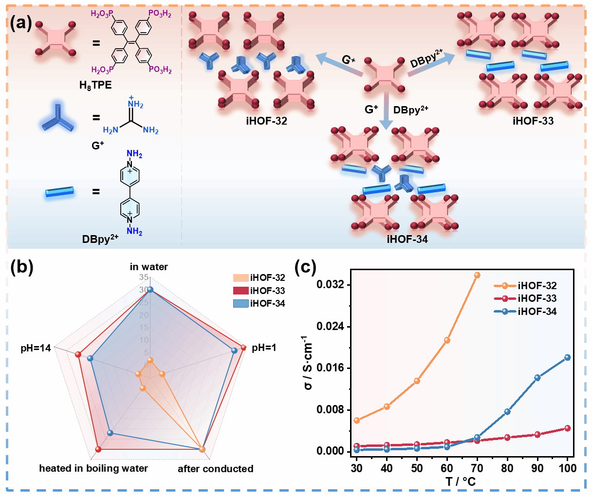 本工作中,通過(guò)多組分電荷輔助氫鍵自組裝策略,以鹽酸胍(G?HCl)、1,1?-二氨基-4,4?-聯(lián)吡啶二碘化合物(DBpy?2I)和1,1,2,2-四(4-膦?;交?乙烯(H8TPE)為原料成功設(shè)計(jì)合成了兩種雙組分iHOFs(iHOF-32,iHOF-33)和一種三組分iHOF(iHOF-34)。其中,富含N和H且鏈長(zhǎng)較短的G?HCl增強(qiáng)了iHOFs的氫鍵網(wǎng)絡(luò),有助于質(zhì)子的有效遷移。DBpy?2I剛性結(jié)構(gòu)為iHOFs提供了額外的支撐。iHOF-34結(jié)合了iHOF-32和iHOF-33的優(yōu)勢(shì)。通過(guò)組分間協(xié)同作用,不僅在強(qiáng)酸堿環(huán)境中保持穩(wěn)定性,還達(dá)到1.81 × 10?2 S·cm?1的高質(zhì)子電導(dǎo)率。此外,制備的9%-iHOF-34/Nafion復(fù)合膜的質(zhì)子電導(dǎo)率峰值為1.55 × 10?1 S·cm?1。在直接甲醇燃料電池中,峰值功率密度達(dá)到80.78 mW·cm?2,是重鑄Nafion膜的1.6倍。該研究通過(guò)精心設(shè)計(jì)的自組裝策略,實(shí)現(xiàn)了對(duì)iHOFs結(jié)構(gòu)和功能的精細(xì)調(diào)控。