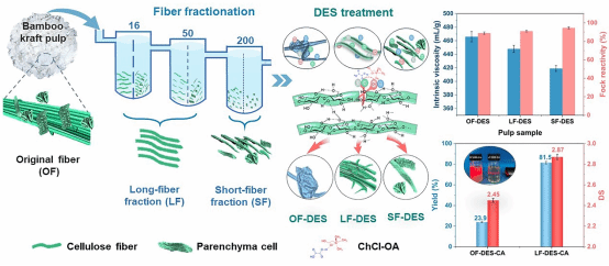 課題組提出了一種漿料纖維篩分與低共熔溶劑處理(DES)協(xié)同處理的工藝,以克服竹硫酸鹽漿(BKP)原料的不均一性和低反應(yīng)性能,將其開發(fā)成不同品質(zhì)的高純度纖維素產(chǎn)品。纖維篩分預(yù)處理篩選出更均勻的纖維組分,即短纖維(SF,薄壁細胞和細纖維)和長纖維(LF,竹纖維)。篩分-DES協(xié)同處理提供了一種有效從低等級竹紙漿升級制備高等級竹溶解漿及其衍生產(chǎn)品的方法。該工作以“Integrating fiber fractionation and deep eutectic solvent treatment to upgrade a bamboo kraft pulp into a cellulose acetate-grade dissolving pulp”發(fā)表在《Separation and Purification Technology》上。22級博士生田超超為本文第一作者,段超教授為該論文的通訊作者。
