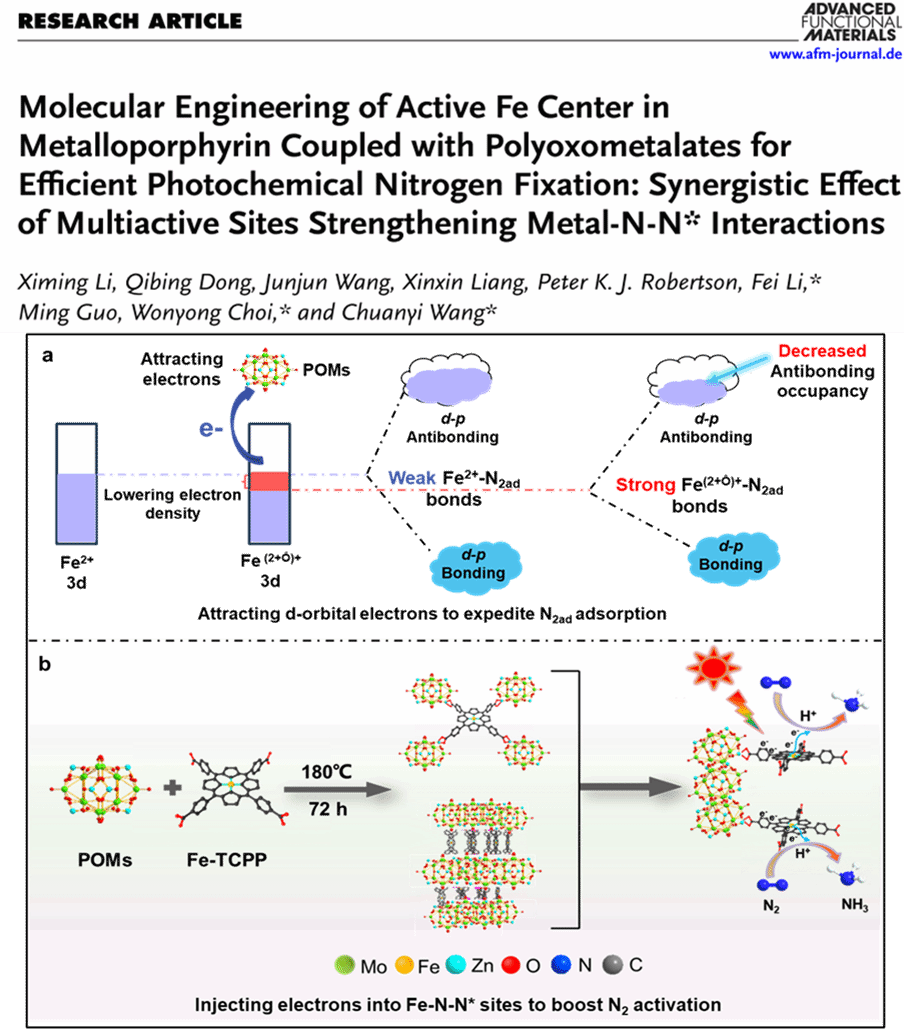 相關(guān)成果以“Molecular engineering of active Fe center in metalloporphyrin coupled with polyoxometalates for efficient photochemical nitrogen fixation: Synergistic effect of multiactive sites strengthening metal-N-N* interactions”為題,發(fā)表在Advanced Functional Materials(IF = 18.5)上。陜西科技大學(xué)為論文第一通訊單位,環(huán)境學(xué)院2021級博士研究生李喜明為該論文的第一作者,環(huán)境學(xué)院王傳義教授為論文通訊作者。