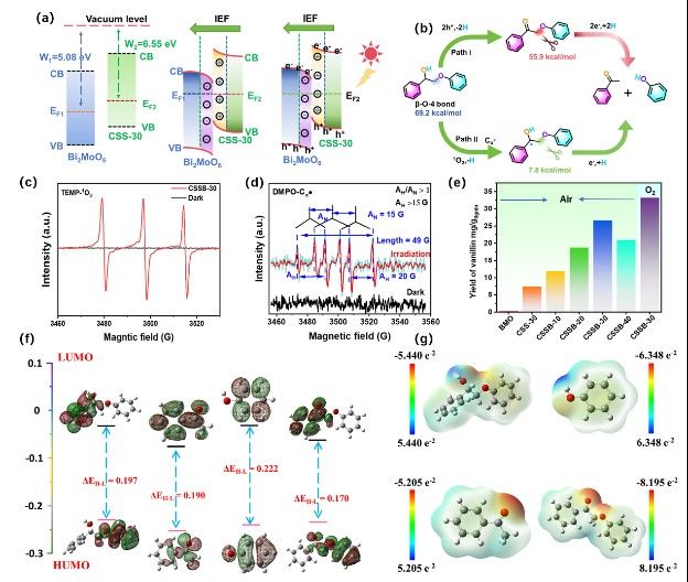 如圖所示,S型異質(zhì)結(jié)的構(gòu)建可以保持高氧化還原電位并改善電荷分離,從而實(shí)現(xiàn)高效光催化反應(yīng)。在Cβ-O鍵的裂解過程中,S型的電荷流動(dòng)方式促進(jìn)了1O2的生成,誘導(dǎo)Cα?自由基的生成。在此過程中Cβ-O鍵的解離能從69.2 kcal/mol大幅衰減到7.8kcal/mol,這一過程促進(jìn)了Cβ-O的劈裂,從而促進(jìn)高值化轉(zhuǎn)化。此外,為了驗(yàn)證CSSB-30光催化劑對實(shí)際木質(zhì)素中Cβ-O帶的裂解能力,以馬尾松堿木質(zhì)素為底物,堿木質(zhì)素Cβ-O裂解的典型產(chǎn)物為香蘭素,獲得了26.6 mg/木質(zhì)素的香蘭素高產(chǎn)率,證明了堿木質(zhì)素中Cβ-O鍵的有效裂解。