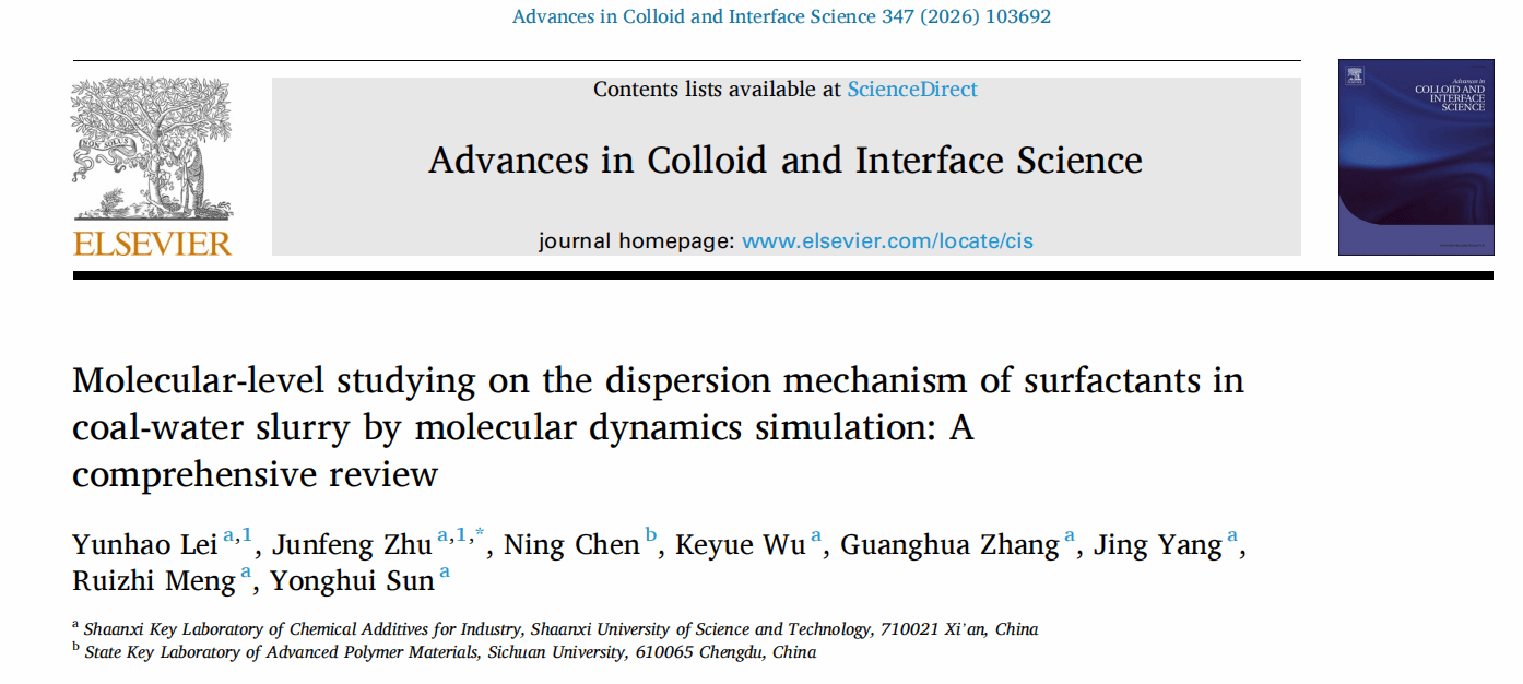 近日,我?;瘜W(xué)與化工學(xué)院應(yīng)用化學(xué)與技術(shù)團(tuán)隊(duì)張光華教授、朱軍峰教授(通訊、共同第一作者)、碩士生雷云浩(第一作者),聯(lián)合四川大學(xué)先進(jìn)高分子材料全國(guó)重點(diǎn)實(shí)驗(yàn)室陳寧研究員,圍繞水煤漿(CWS)清潔利用的核心技術(shù)難題,通過(guò)實(shí)驗(yàn)與分子動(dòng)力學(xué)(MD)模擬相結(jié)合,揭示了表面活性劑在水煤漿中的微觀分散機(jī)理,為高效、環(huán)保水煤漿分散劑的理性設(shè)計(jì)提供了全新理論框架。相關(guān)成果以 “Molecular-level studying on the dispersion mechanism of surfactants in coal-water slurry by molecular dynamics simulation: A comprehensive review” 為題,發(fā)表于膠體與界面科學(xué)領(lǐng)域國(guó)際頂級(jí)期刊《Advances in Colloid and Interface Science》(中科院一區(qū)Top, IF 19.262)(2026 年,Volume 347, 103692,DOI: 10.1016/j.cis.2025.103692)。該期刊是化學(xué)工程、材料科學(xué)領(lǐng)域?qū)W者獲取前沿理論與技術(shù)的重要平臺(tái),其發(fā)表的綜述類文章常被作為領(lǐng)域內(nèi)研究的關(guān)鍵參考依據(jù)。