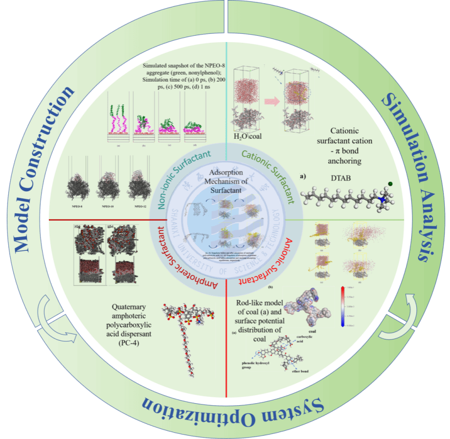 文章以 “ 煤 - 表面活性劑 - 水” 三元體系為研究對(duì)象,通過(guò)分子動(dòng)力學(xué)模擬結(jié)合實(shí)驗(yàn)驗(yàn)證,系統(tǒng)闡明了非離子、陽(yáng)離子、兩性、陰離子四類表面活性劑的分散機(jī)制,并建立了分散劑理性設(shè)計(jì)的技術(shù)框架,核心成果如下: