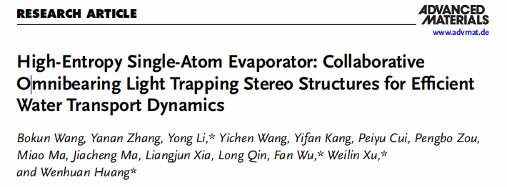 實(shí)現(xiàn)高效光熱界面蒸發(fā)需要協(xié)同集成熱管理、水傳輸動(dòng)力學(xué)和光捕獲這三個(gè)關(guān)鍵要素,而這些要素往往難以協(xié)調(diào)。近日,化學(xué)與化工學(xué)院黃文歡教授課題組與合作者在光熱轉(zhuǎn)換材料領(lǐng)域取得重要進(jìn)展。團(tuán)隊(duì)通過(guò)一種綠色、簡(jiǎn)便的方法,成功設(shè)計(jì)并制備出一種具有超低金屬含量的高熵單原子光熱材料。該材料具備可調(diào)控的分層納米/微/宏觀多孔結(jié)構(gòu),顯著提升了光吸收效率。將高熵單原子與聚合物體系結(jié)合,采用化學(xué)發(fā)泡交聯(lián)技術(shù)構(gòu)建出穩(wěn)定的三維多孔網(wǎng)絡(luò)結(jié)構(gòu),并通過(guò)自組裝策略進(jìn)一步調(diào)控形貌,形成獨(dú)特的錐形陣列結(jié)構(gòu)。該結(jié)構(gòu)可有效增強(qiáng)光在材料表面的多次反射與捕獲,大幅提高太陽(yáng)光的利用率。實(shí)驗(yàn)結(jié)果表明,所制備的光熱蒸發(fā)器在標(biāo)準(zhǔn)太陽(yáng)光照(1 kW m-2)下展現(xiàn)出優(yōu)異的光熱水蒸發(fā)性能,同時(shí)具備出色的光吸收能力與能量轉(zhuǎn)換效率,為高效太陽(yáng)能驅(qū)動(dòng)海水淡化、污水處理等可持續(xù)能源應(yīng)用提供了全新的材料設(shè)計(jì)思路。研究成果發(fā)表于學(xué)術(shù)期刊Advanced Materials,題為“High-Entropy Single-Atom Evaporator: Collaborative Omnibearing Light Trapping Stereo Structures for Efficient Water Transport Dynamics”。