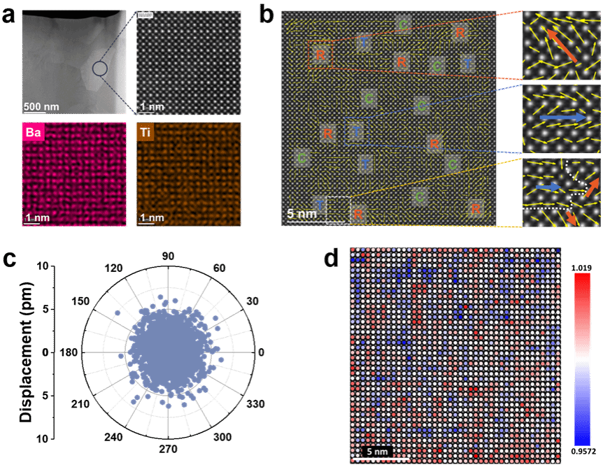 為突破上述瓶頸,研究者們嘗試通過構(gòu)建納米疇結(jié)構(gòu)、優(yōu)化化學(xué)組成、設(shè)計核殼結(jié)構(gòu)、調(diào)控電場均一性等手段提升儲能性能。然而,這些方法在提升最大極化(Pmax)與擊穿場強(Eb)的同時,往往難以兼顧低剩余極化(Pr)與高儲能效率(η),且熱穩(wěn)定性仍不理想。針對上述問題,陜西科技大學(xué)材料科學(xué)與工程學(xué)院楊海波教授團隊以BaTiO3為基體,采用相場模擬指導(dǎo)高熵設(shè)計策略,選取Na+、Sr2+、Ca2+、Bi3+作為A位摻雜離子,選取Zn2+、Zr4+、Ta5+、Nb5+作為B位摻雜離子。通過固相燒結(jié)工藝,最終制備出具有梯度構(gòu)型熵的BaTiO3基高熵陶瓷體系,如圖1所示。利用原子級高角環(huán)形暗場掃描透射電子顯微鏡(HAADF-STEM)進行表征,結(jié)果發(fā)現(xiàn)A/B位多元素共占位現(xiàn)象誘導(dǎo)產(chǎn)生了顯著的晶格畸變,有效促成了T-R-C多相共存的局域極化構(gòu)型,如圖2所示。而這種特殊的微觀結(jié)構(gòu)能夠有效降低材料的極化各向異性與電疇翻轉(zhuǎn)勢壘,為后續(xù)儲能性能的優(yōu)化奠定了關(guān)鍵的結(jié)構(gòu)基礎(chǔ)。在此基礎(chǔ)上,研究團隊利用構(gòu)型熵值為2.13R的高熵陶瓷粉體制備出具有優(yōu)良的燒結(jié)質(zhì)量和微觀結(jié)構(gòu)的MLCCs原型器件。在1065 kV·cm-1的高電場強度下,2.13R-MLCCs展現(xiàn)出了優(yōu)異的綜合儲能性能(Wrec ~ 17.2 J·cm-3,η ~ 95.5%),且在寬溫區(qū)與長循環(huán)條件下性能穩(wěn)定,如圖3所示。該研究系統(tǒng)揭示了構(gòu)型熵與極化構(gòu)型、儲能性能之間的內(nèi)在聯(lián)系,為高性能MLCCs的設(shè)計與產(chǎn)業(yè)化提供了新思路和技術(shù)路徑。