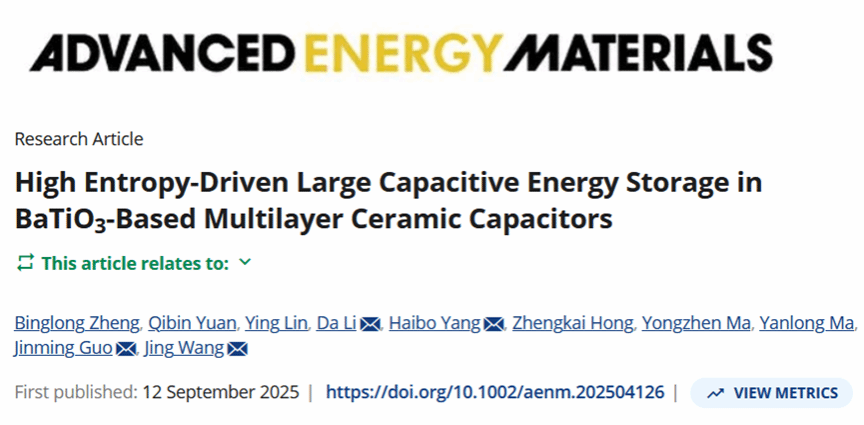 近日,材料科學(xué)與工程學(xué)院楊海波教授團隊,在國際頂級期刊《Advanced Energy Materials》(IF:26)上發(fā)表了題為“High Entropy-Driven Large Capacitive Energy Storage in BaTiO3-Based Multilayer Ceramic Capacitors”的研究論文,并被選為當(dāng)期Front Cover(前封面)。我校李達博士后,楊海波教授,湖北大學(xué)郭金明教授和南京航空航天大學(xué)王婧教授為共同通訊作者,陜西科技大學(xué)材料學(xué)院博士生鄭秉龍,電智學(xué)院袁啟斌副教授和材料學(xué)院林營教授為共同第一作者,陜西科技大學(xué)為第一通訊單位。