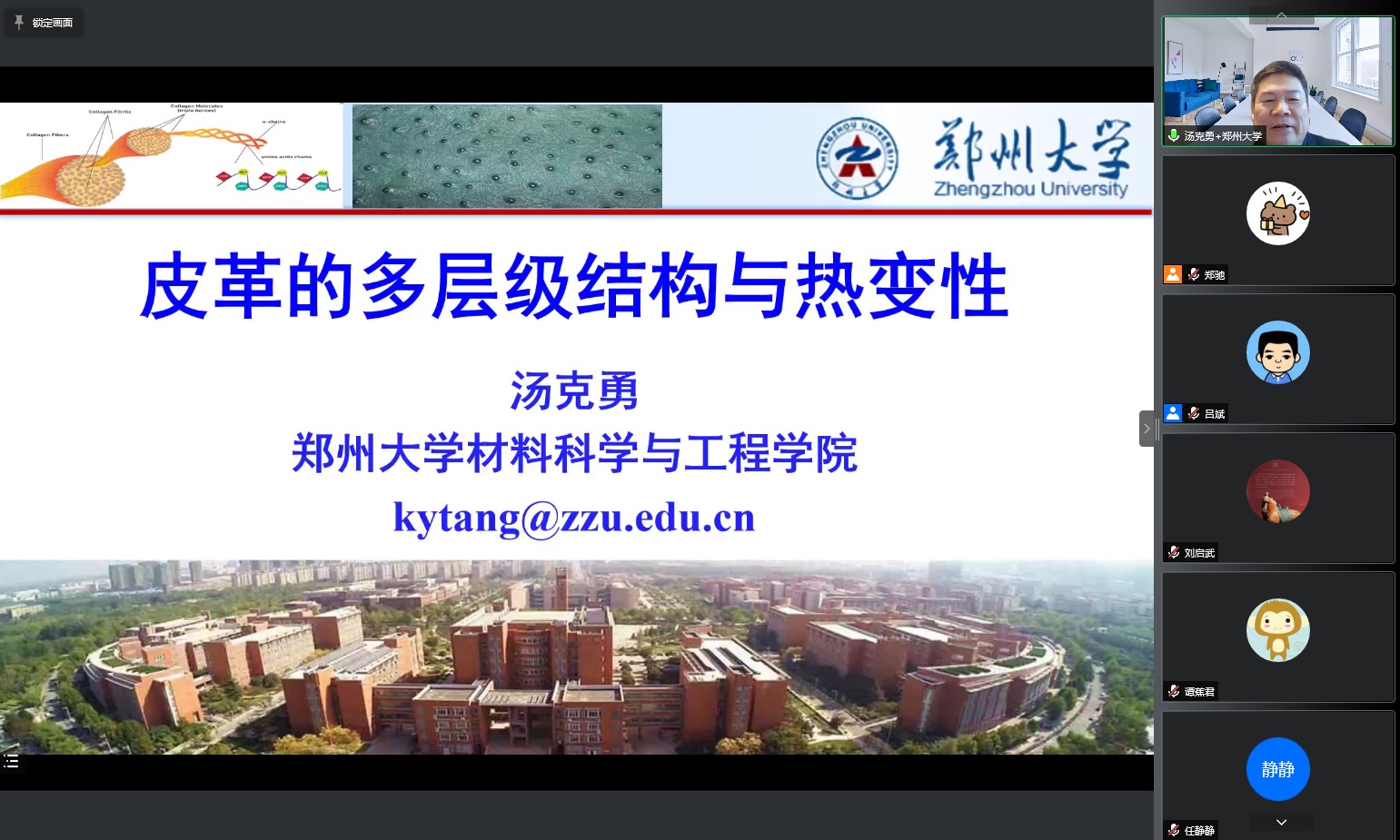 湯克勇教授的報告主要圍繞皮革-一種重要的膠原基材料、皮革與皮膠原的多層級結(jié)構(gòu)及皮革與膠原的熱變化、熱收縮變性、熱降解行為等方面展開。報告結(jié)束后,湯克勇教授與參會師生就相關(guān)專業(yè)問題進(jìn)行了探討和解答,線上氣氛熱烈,開闊了學(xué)院師生在皮革的多層級結(jié)構(gòu)與熱變性方面研究的視野。
