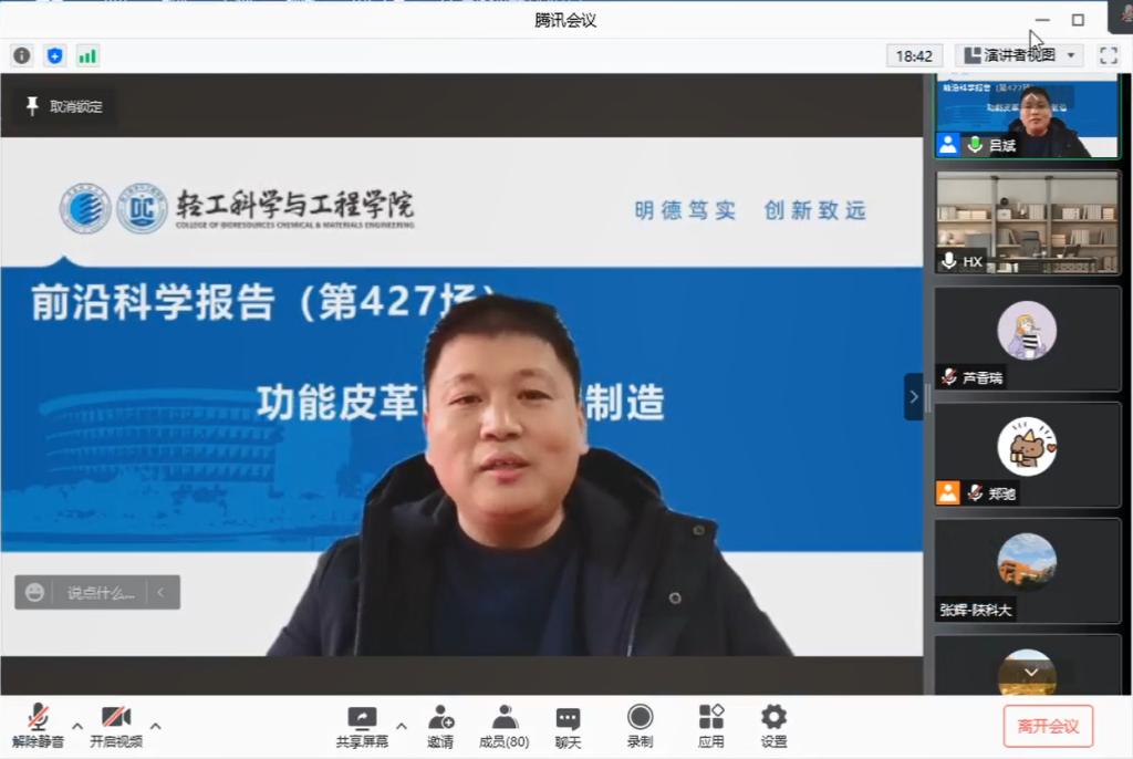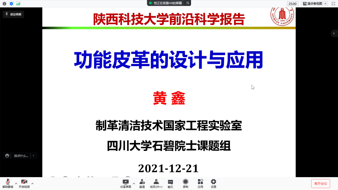 12月21日上午,受輕工科學(xué)與工程學(xué)院、科技處及前沿院邀請,國家優(yōu)秀青年科學(xué)基金獲得者四川大學(xué)黃鑫研究員以線上形式就“功能皮革的設(shè)計與制造”與輕工學(xué)院師生進行深入交流。報告由輕工學(xué)院院長呂斌主持,學(xué)院相關(guān)專業(yè)教師及研究生參加了本次學(xué)術(shù)報告會。