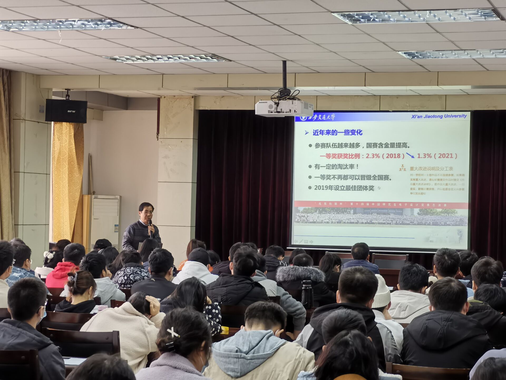 為切實提升我校研究生創(chuàng)新實踐能力,活躍科研氛圍,12月15日,應(yīng)機電學(xué)院邀請,全國研究生電子設(shè)計競賽(研電賽)評審專家——西安交通大學(xué)吳勝利教授做客我校“未央導(dǎo)師論壇”,并作了題為“中國研究生電子設(shè)計競賽分析”的報告。報告會由機電學(xué)院副院長楊立軍主持,機電學(xué)院部分教師、研究生參加了報告會。