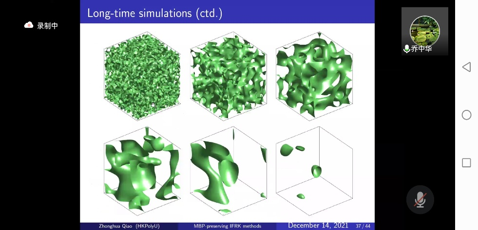 12月14日上午,應數(shù)學與數(shù)據(jù)科學學院邀請,香港理工大學喬中華教授做客我?!扒把乜茖W報告”,通過騰訊會議作了題為“Maximum bound principle preserving integrating factor Runge-Kutta methods for semilinear parabolic equations”的線上報告。報告會由數(shù)學學院副院長李劍教授主持,學院相關(guān)專業(yè)教師和研究生參加了報告會。
