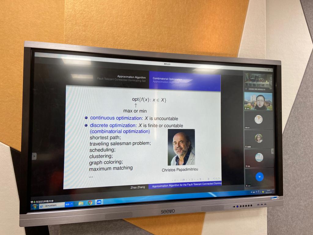 報(bào)告會(huì)上,張昭教授首先通過形象生動(dòng)的語言介紹了組合優(yōu)化領(lǐng)域的近似算法,講述了有關(guān)該算法的理論、計(jì)算以及目標(biāo),然后主要說明了針對(duì)容錯(cuò)連通控制集構(gòu)造的一些近似算法,重點(diǎn)介紹了設(shè)計(jì)與分析的方法和思路。張昭教授表示組合優(yōu)化領(lǐng)域重在多方向融合,并與參加報(bào)告的師生進(jìn)行了相關(guān)問題的探討。