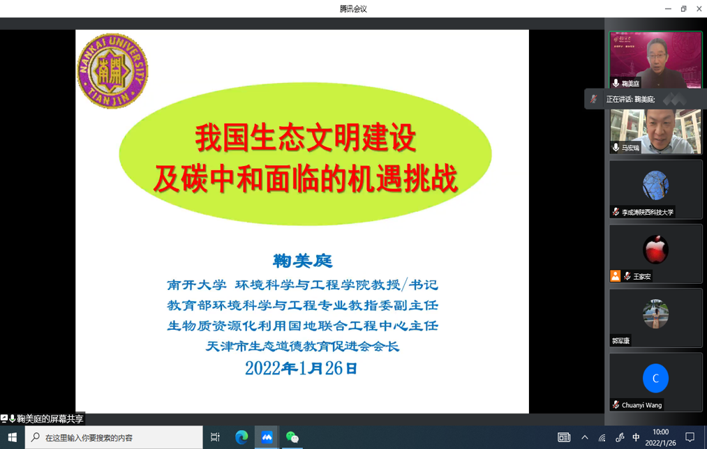 1月26日,應(yīng)環(huán)境科學(xué)與工程學(xué)院邀請,教育部環(huán)境科學(xué)與工程類專業(yè)教指委副主任委員、南開大學(xué)環(huán)境科學(xué)與工程學(xué)院鞠美庭教授做客我?!敖逃虒W(xué)論壇”,作了題為“我國生態(tài)文明建設(shè)及碳中和面臨的機遇挑戰(zhàn)”的線上專題報告,環(huán)境學(xué)院全體師生參加報告會。會議由環(huán)境學(xué)院院長馬宏瑞教授主持。
