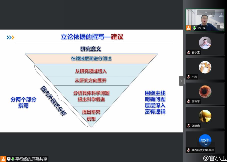 2月17日上午,受我校輕工科學(xué)與工程學(xué)院、科技處、前沿院邀請,空軍軍醫(yī)大學(xué)張偉教授做客我?!扒把乜茖W(xué)報(bào)告”,作了題為“國家自然科學(xué)基金撰寫技巧及注意事項(xiàng)”的報(bào)告。報(bào)告會(huì)由輕工學(xué)院副院長劉國棟主持,線上線下同時(shí)進(jìn)行,輕工學(xué)院部分專任教師參加了本次報(bào)告會(huì)。