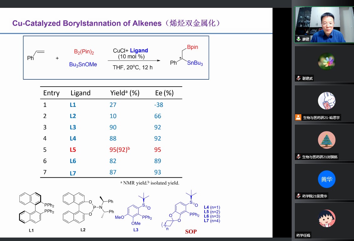 廖建研究員則基于手性的叔丁基亞磺酰胺設(shè)計了新型的膦配體,該配體催化性能非常好,主要體現(xiàn)在解決了不對稱合成上一些難以解決的反應(yīng),并且獲得了很好的收率及對映選擇性,特別是該類型催化劑在一些反應(yīng)能夠通過微調(diào),從而實現(xiàn)立體選擇性的翻轉(zhuǎn)。