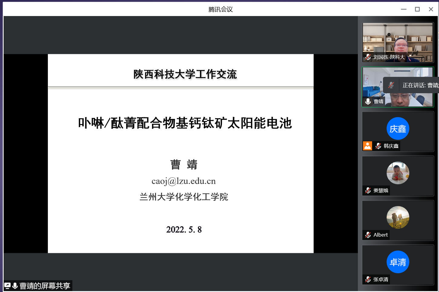 5月9日上午,應(yīng)我校輕工科學(xué)與工程學(xué)院、科技處及前沿院邀請(qǐng),蘭州大學(xué)曹靖教授做客我校前沿科學(xué)報(bào)告,作了題為“卟啉/酞菁配合物基鈣鈦礦太陽(yáng)能電池”的線上學(xué)術(shù)報(bào)告。報(bào)告會(huì)由科學(xué)與工程學(xué)院副院長(zhǎng)劉國(guó)棟主持,學(xué)院相關(guān)專業(yè)教師及部分研究生聆聽了此次報(bào)告會(huì)。