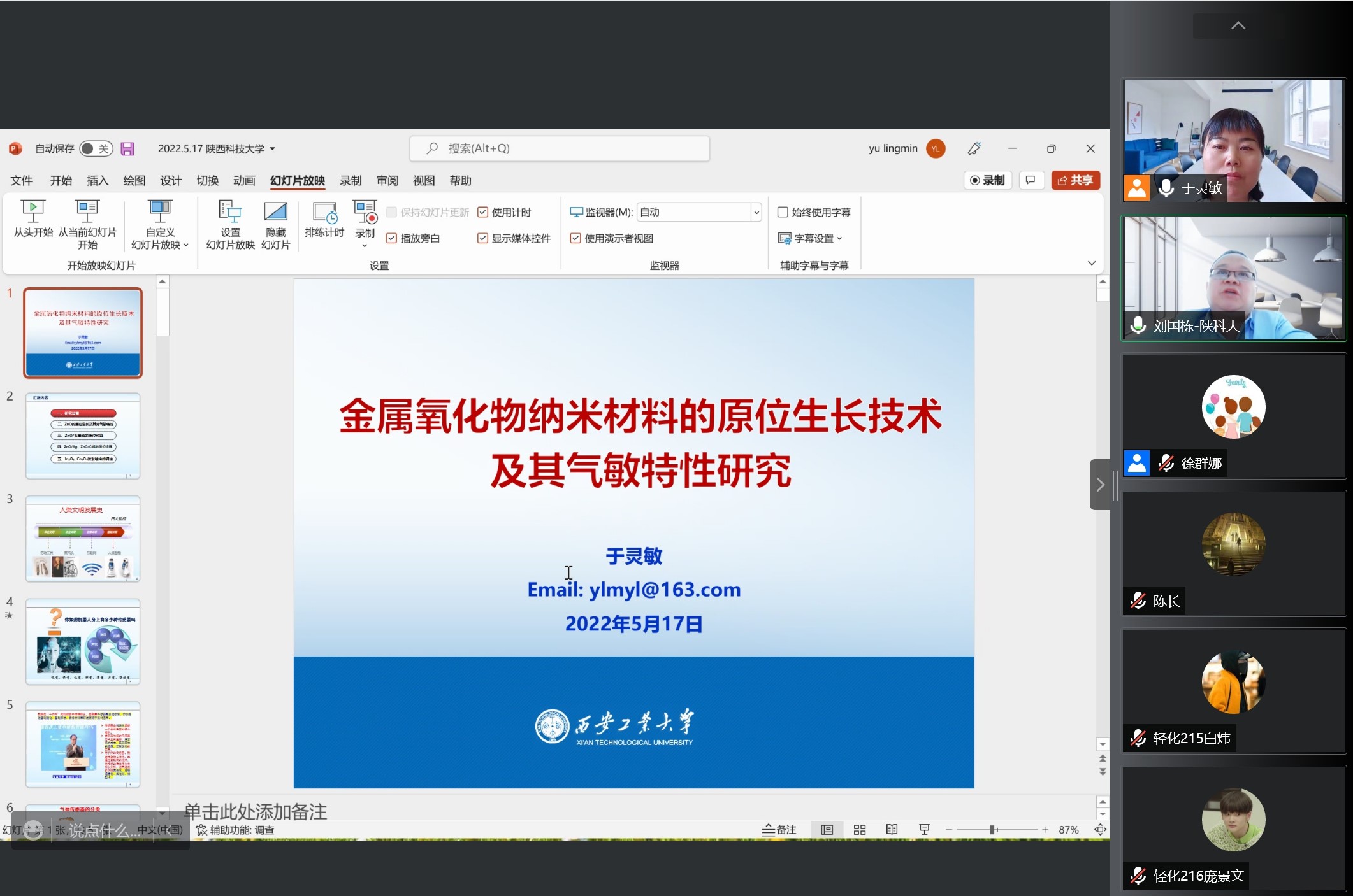 5月17日下午,應(yīng)我校輕工科學(xué)與工程學(xué)院、科技處、前沿院邀請,西安工業(yè)大學(xué)于靈敏教授做客我校“前沿科學(xué)報告”,作了題為“金屬氧化物半導(dǎo)體納米材料的原位合成技術(shù)及氣敏特性研究”的線上報告。報告會由輕工學(xué)院副院長劉國棟主持,輕工學(xué)院相關(guān)專業(yè)教師、研究生參加了此次報告會。