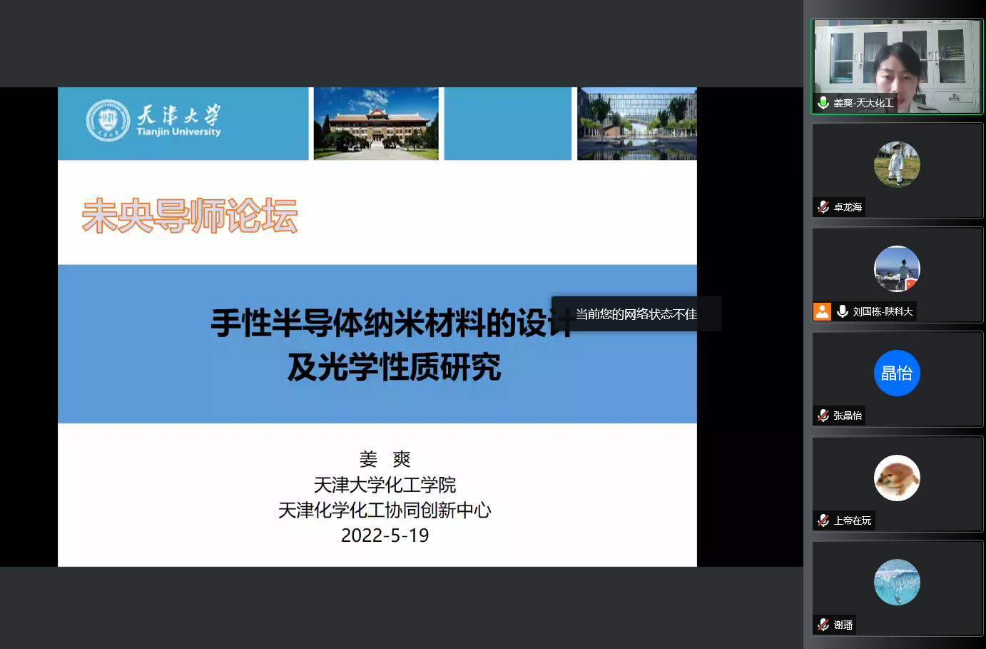 5月19日下午,應(yīng)輕工科學(xué)與工程學(xué)院和研究生院邀請(qǐng),天津大學(xué)姜爽副教授做客我校“未央導(dǎo)師論壇”,作了題為“手性半導(dǎo)體納米材料的設(shè)計(jì)及光學(xué)性質(zhì)研究”的線上學(xué)術(shù)報(bào)告。報(bào)告會(huì)由輕工學(xué)院副院長(zhǎng)劉國(guó)棟主持,學(xué)院相關(guān)專業(yè)教師及研究生聆聽了此次報(bào)告會(huì)。