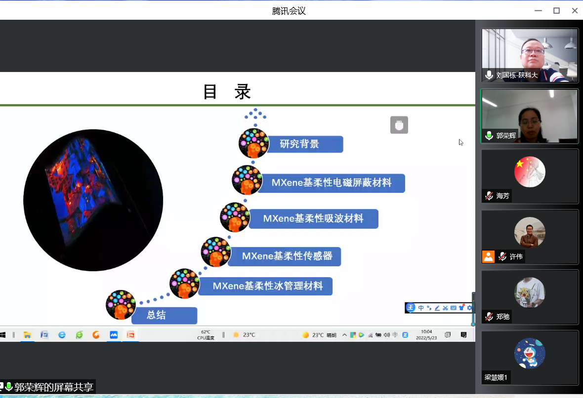 郭榮輝教授從研究背景入手,重點介紹了MXene基柔性電磁屏蔽材料、MXene基柔性吸波材料、MXene基柔性傳感器及MXene基柔性冰管理材料在國防、生命健康等領域的重大需求及其團隊在該領域研究進展和經驗分享,報告內容系統(tǒng)豐富,引人入勝。