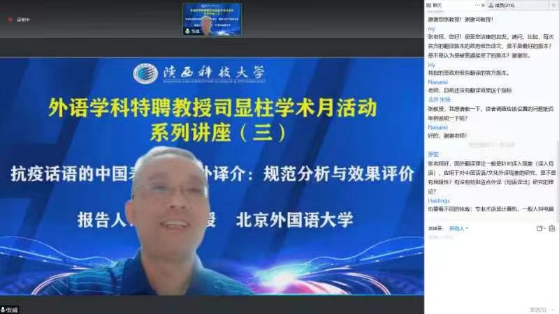 司顯柱教授點(diǎn)評時指出,中國抗疫話語的世界表達(dá)是契合對外講好中國故事這一國家戰(zhàn)略需求的研究,張教授的微觀分析和宏觀思考對翻譯實(shí)踐與研究具有重要指導(dǎo)意義,與會聽眾獲益匪淺。