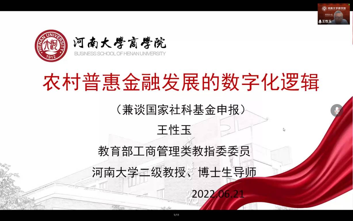 6月21日,應(yīng)我??萍继?、經(jīng)濟(jì)與管理學(xué)院邀請(qǐng),河南大學(xué)商學(xué)院院長王性玉教授做客我?!扒把乜茖W(xué)報(bào)告”,為我校師生帶來主題為“農(nóng)村普惠金融發(fā)展的數(shù)字化邏輯--兼談國家社科基金申報(bào)”的線上報(bào)告。報(bào)告由經(jīng)管學(xué)院副院長薛儉主持,經(jīng)管學(xué)院教師、研究生代表聆聽了此次報(bào)告。