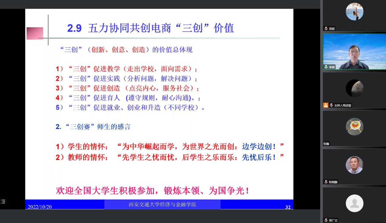 李琪教授從五力協(xié)同、換道超車、跨境電商、“三創(chuàng)”人才培養(yǎng)等四個方面,結合電子商務“創(chuàng)新、創(chuàng)意、創(chuàng)業(yè)”的人才培養(yǎng)模式,梳理了中國電子商務的創(chuàng)新發(fā)展歷程、跨境電子商務的發(fā)展價值,解析了電子商務類專業(yè)發(fā)展的特色、培養(yǎng)要求等,重點分析了跨境電商的最新國家政策和發(fā)展模式、發(fā)展趨勢。同時,李教授從社會需求和高校供給兩個方面,闡釋了創(chuàng)新型人才培育的重要價值和現(xiàn)實意義,探討了大力培養(yǎng)創(chuàng)新型人才的必要性、重要價值和具體路徑。報告最后,李教授分享了電子商務“創(chuàng)新、創(chuàng)意及創(chuàng)業(yè)”挑戰(zhàn)賽的目標、意義和具體發(fā)展歷程,重點解讀了“三創(chuàng)賽”對于促進教學、促進實踐、促進創(chuàng)造、促進育人、促進就業(yè)創(chuàng)業(yè)和深造的重要價值。