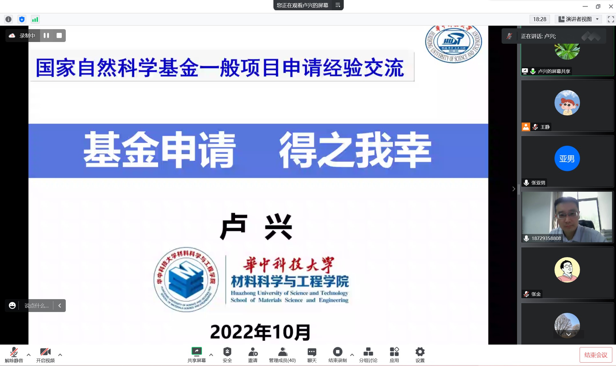 10月13日,受我??萍继帯⒒瘜W(xué)與化工學(xué)院邀請,華中科技大學(xué)盧興教授做客我校“前沿科學(xué)報(bào)告”,為我校師生帶來題目為“國家自然科學(xué)基金申報(bào)指導(dǎo)講座”的線上報(bào)告。報(bào)告由化工學(xué)院院長費(fèi)貴強(qiáng)教授主持,相關(guān)教師參加了此次報(bào)告。