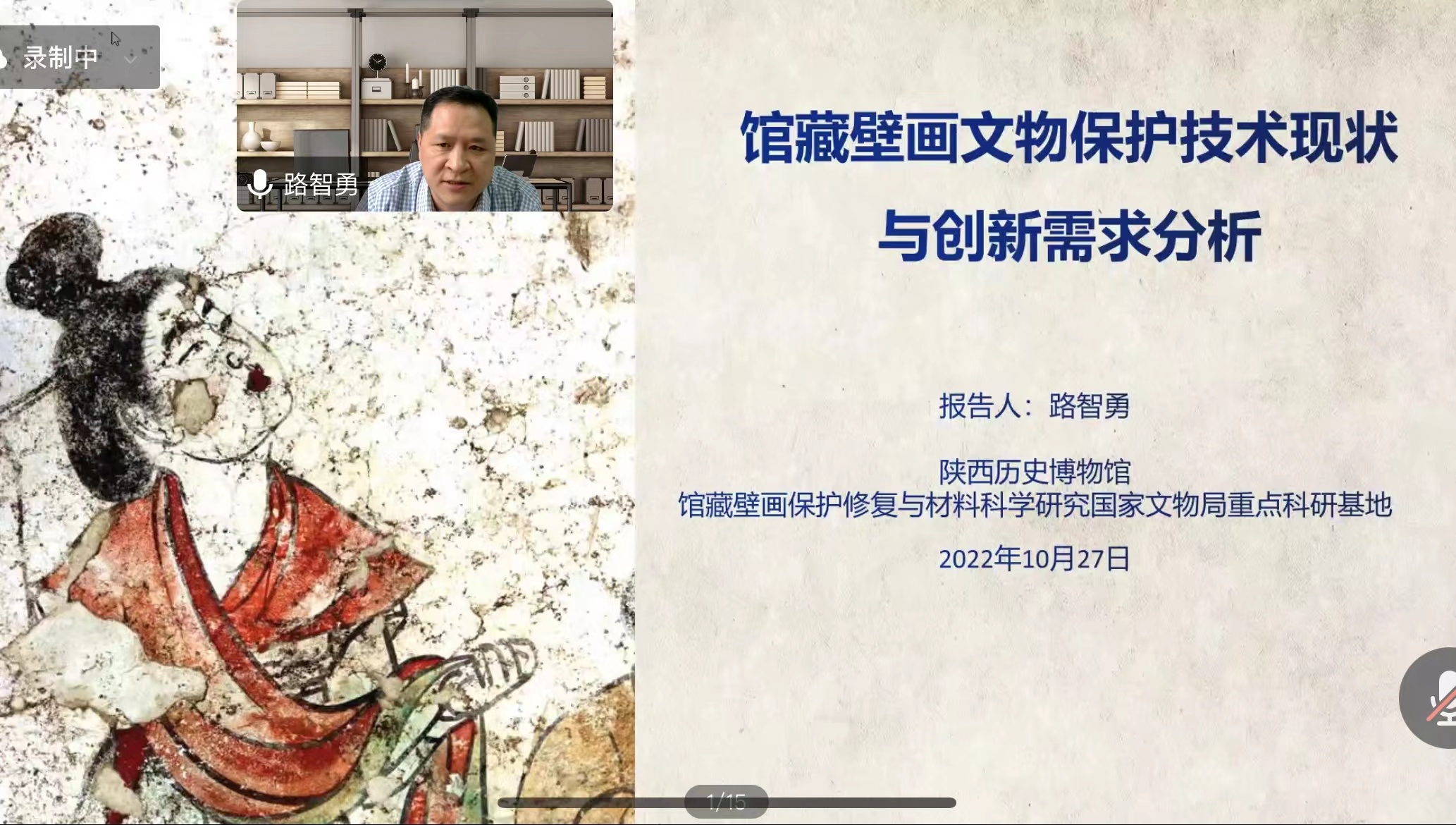 10月27日,應(yīng)我??萍继帯⒉牧峡茖W(xué)與工程學(xué)院(文物保護(hù)科學(xué)與技術(shù)學(xué)院)邀請(qǐng),陜西歷史博物館路智勇研究員做客我?!扒把乜茖W(xué)報(bào)告”,作了題為“館藏壁畫保護(hù)技術(shù)現(xiàn)狀與創(chuàng)新需求分析”的線上學(xué)術(shù)報(bào)告。報(bào)告由材料學(xué)院院長(zhǎng)朱建鋒教授主持,學(xué)院相關(guān)領(lǐng)域教師和研究生參加了此次報(bào)告會(huì)。