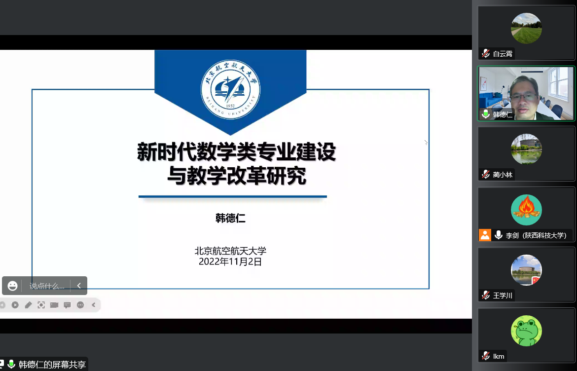 11月2日晚,應(yīng)我校教務(wù)處、數(shù)學(xué)與數(shù)據(jù)科學(xué)學(xué)院邀請,北京航空航天大學(xué)韓德仁教授做客我?!敖逃虒W(xué)論壇”,做了題為“新時(shí)代數(shù)學(xué)類專業(yè)建設(shè)與教學(xué)改革研究”的線上學(xué)術(shù)報(bào)告。副校長王學(xué)川出席報(bào)告會并致辭。數(shù)學(xué)學(xué)院全體教師參加了本次學(xué)術(shù)報(bào)告會。報(bào)告會由數(shù)學(xué)學(xué)院院長李劍教授主持。