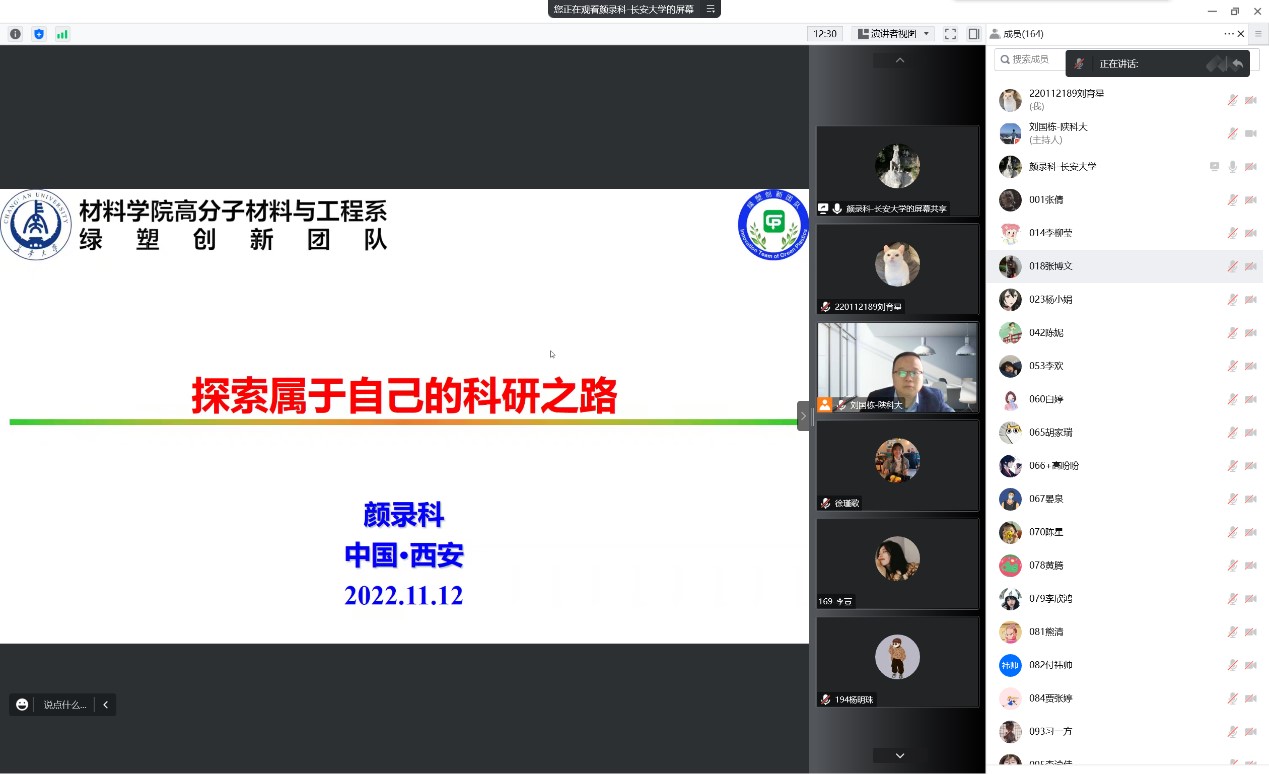 為了幫助研究生新生樹立正確的學(xué)習(xí)觀,掌握研究生階段的科研方法和學(xué)術(shù)規(guī)范,11月12日上午,我校研究生院和輕工科學(xué)與工程學(xué)院(柔性電子學(xué)院)邀請(qǐng)長(zhǎng)安大學(xué)顏錄科教授做客“未央導(dǎo)師論壇”,作了題為“探索屬于自己的科研之路”的線上學(xué)術(shù)報(bào)告。報(bào)告會(huì)由輕工學(xué)院副院長(zhǎng)劉國(guó)棟主持。學(xué)院2022級(jí)全體研究生新生參加了報(bào)告會(huì)。