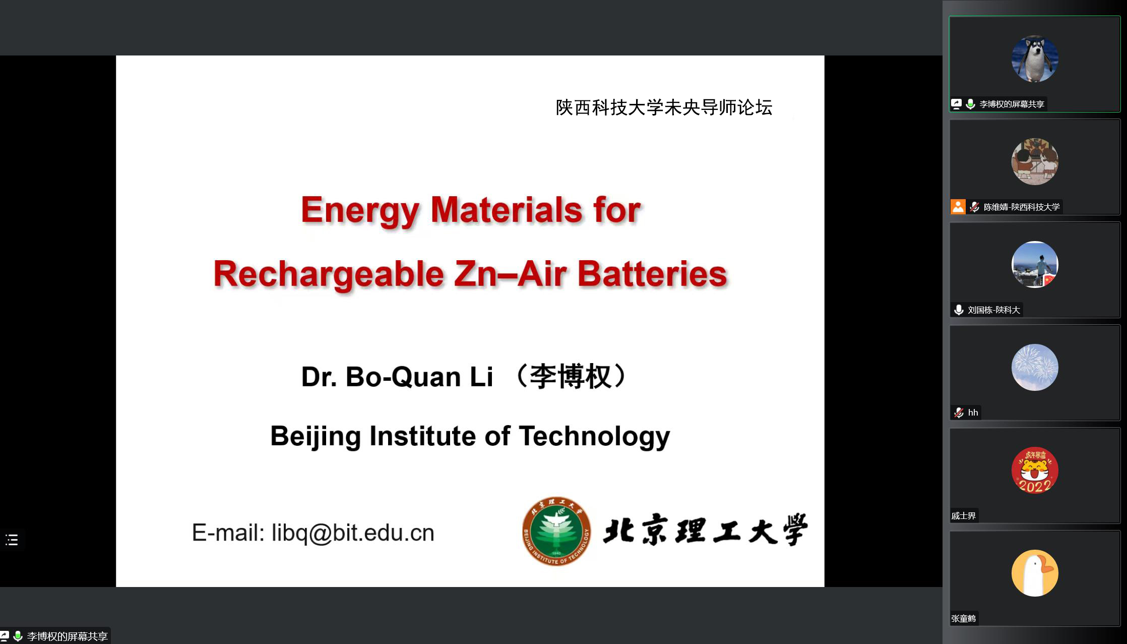 11月17日,應我校柔性電子學院和研究生院邀請,北京理工大學李博權(quán)副研究員做客我?!拔囱雽熣搲?,作了題為“二次鋅空氣電池的多相界面設計與調(diào)控”的線上學術(shù)報告。報告會由柔性電子學院副院長劉國棟主持,相關(guān)專業(yè)教師和研究生參加了此次報告會。